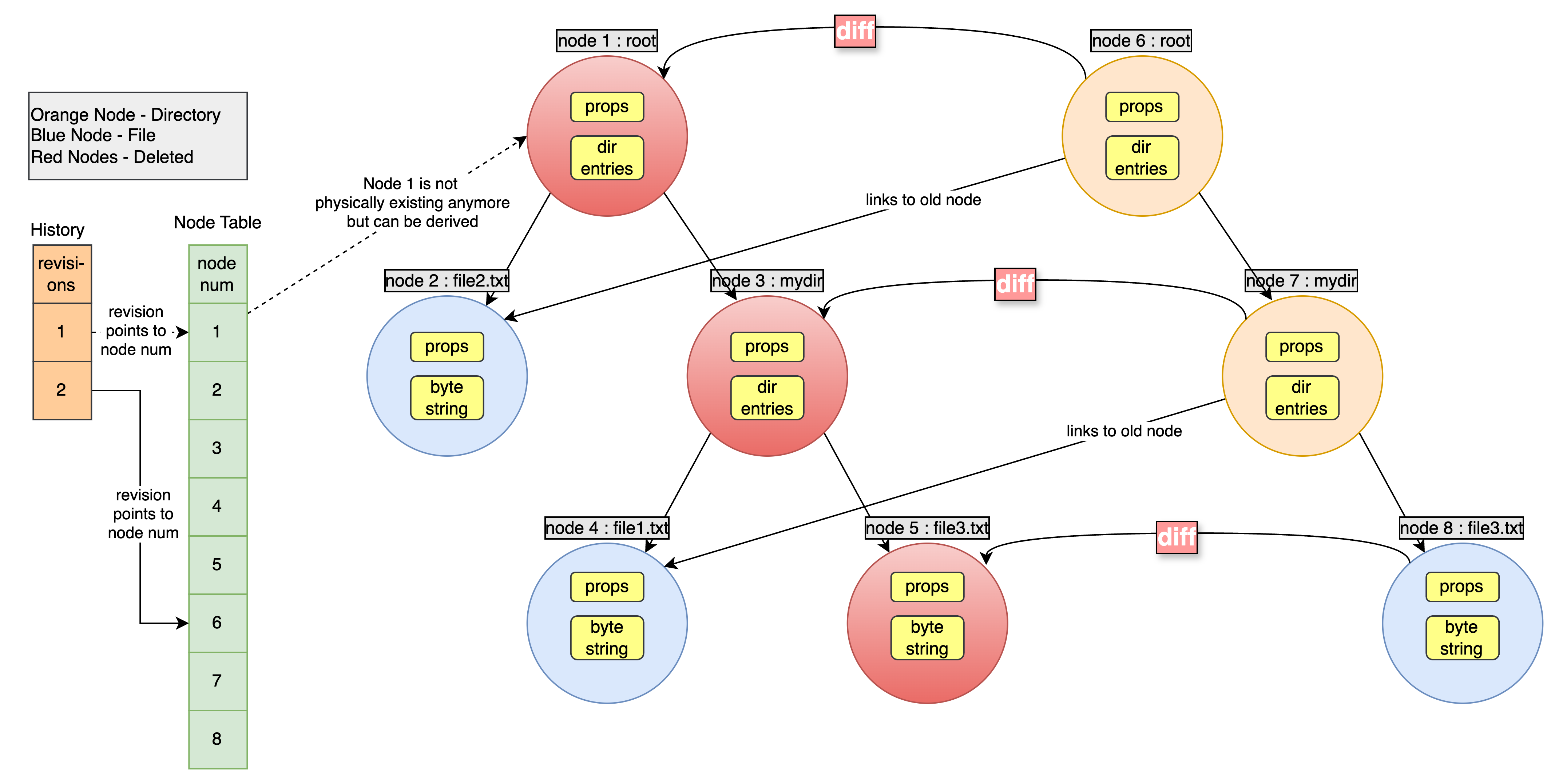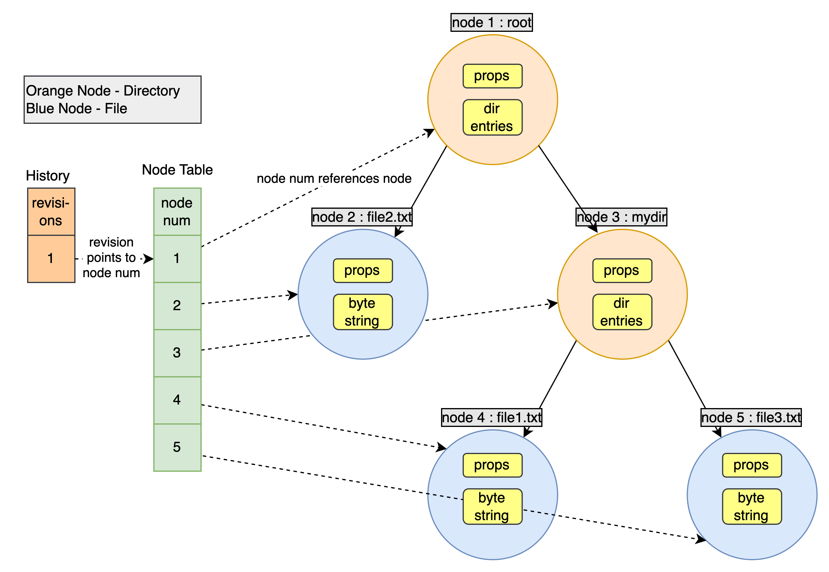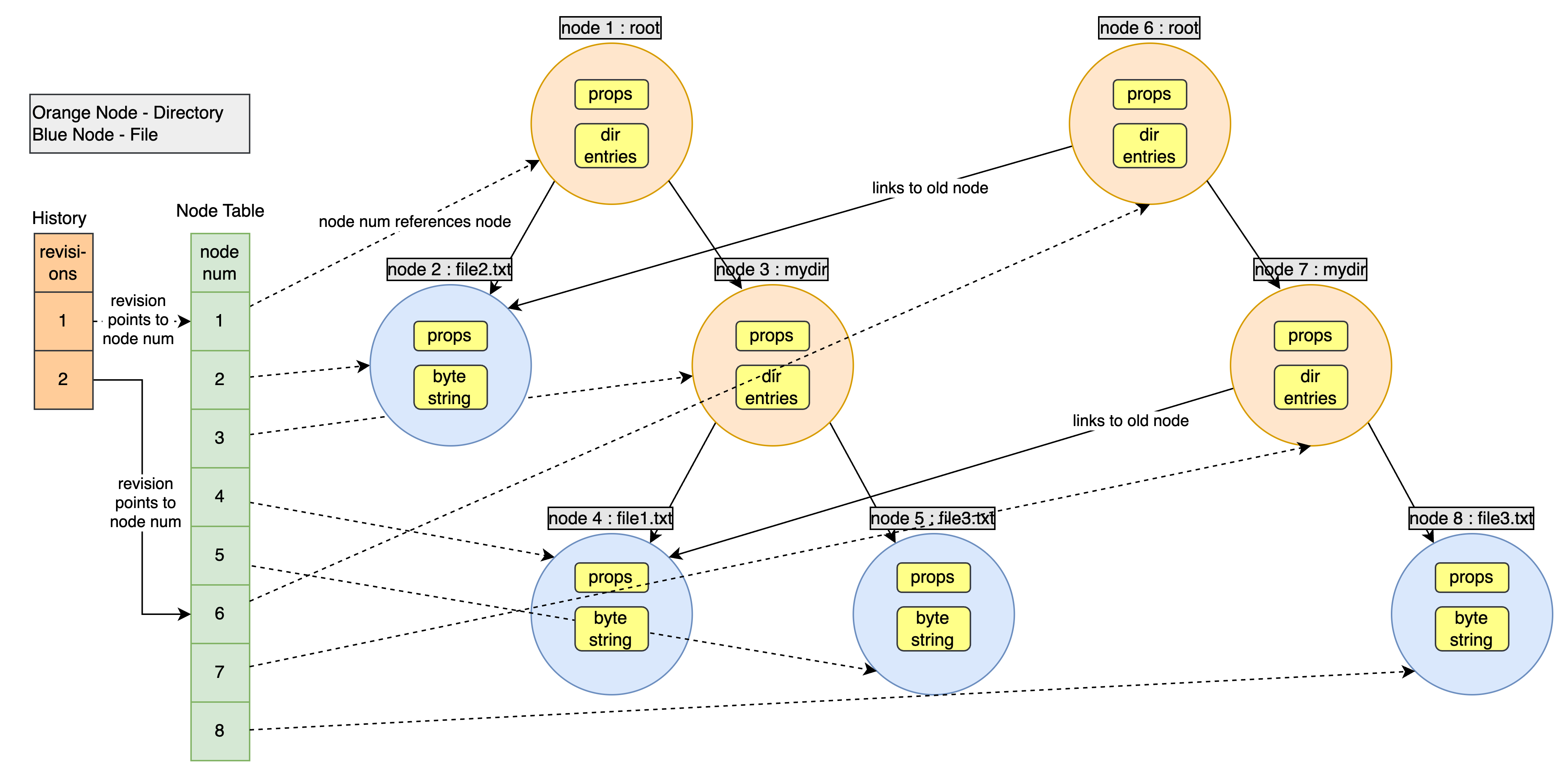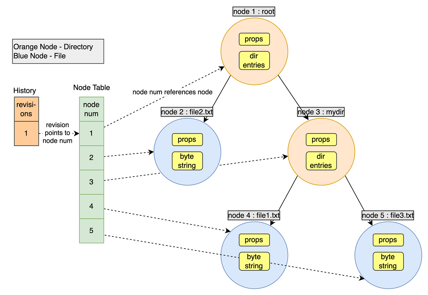 The below image uses the history array, the node table and nodes to represent the above thought process schematically. Note that when referring to revision 1, you have an access to node number 1 which points to an actual, logical node, which in this case, is a root directory. So with revision 1, you have access to the whole directory at that point of time.