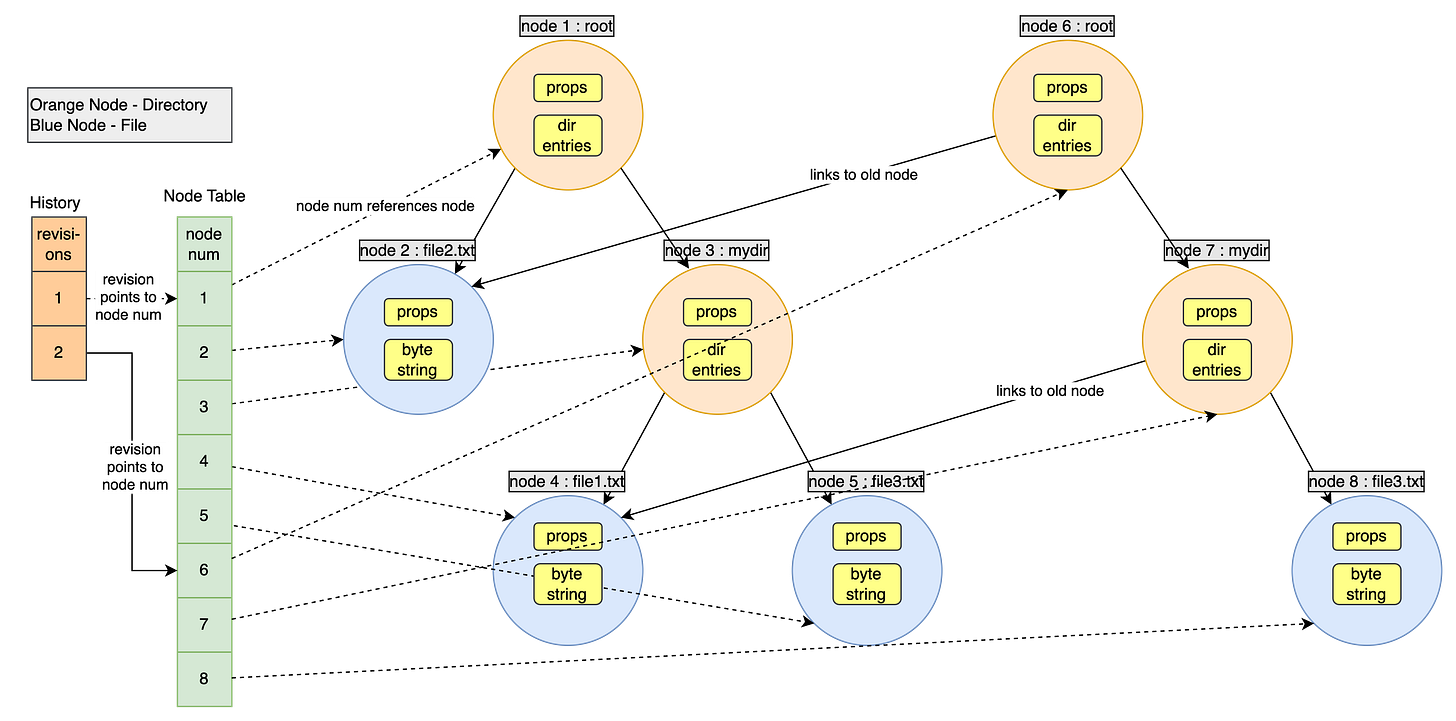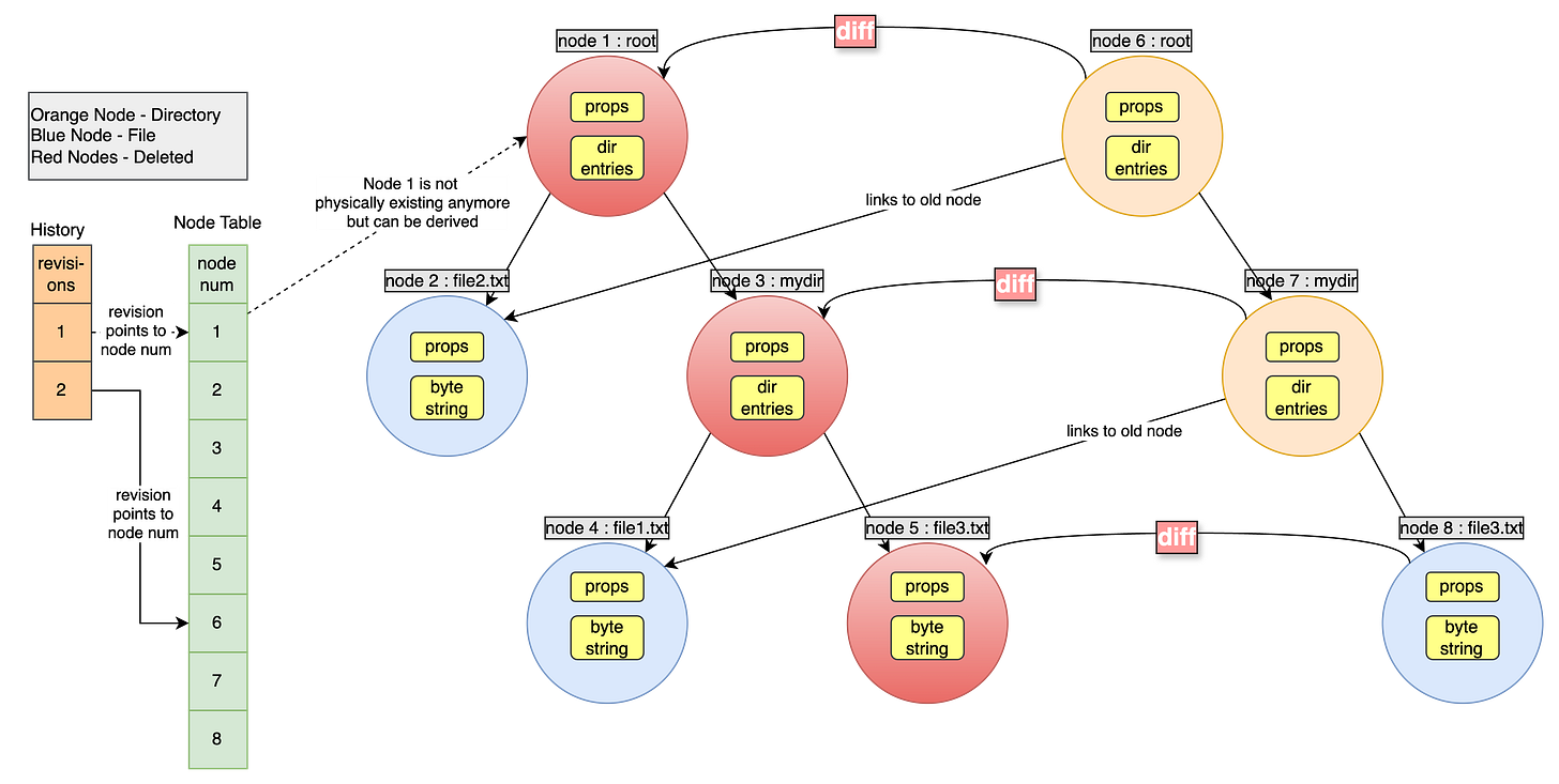 A revision is just a number that also holds a pointer to a node number. If a revision “x” points to a node number “y”, the node and all the child nodes under it are said to belong to revision “x”. In SVN, revisions are monotonically increasing numbers.