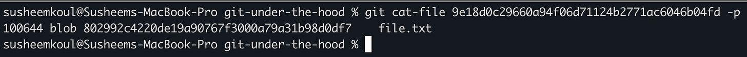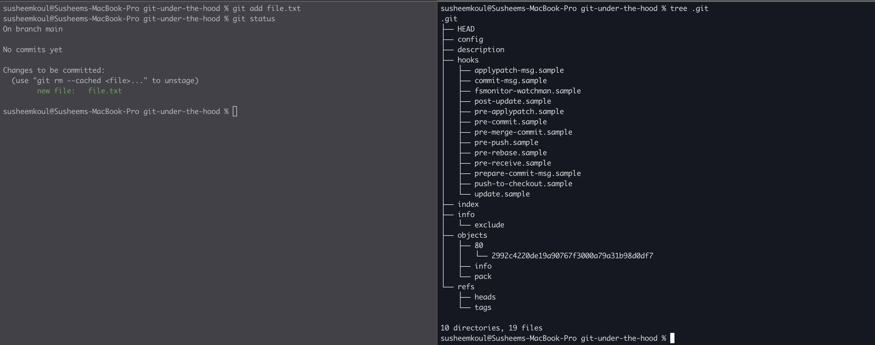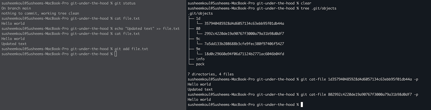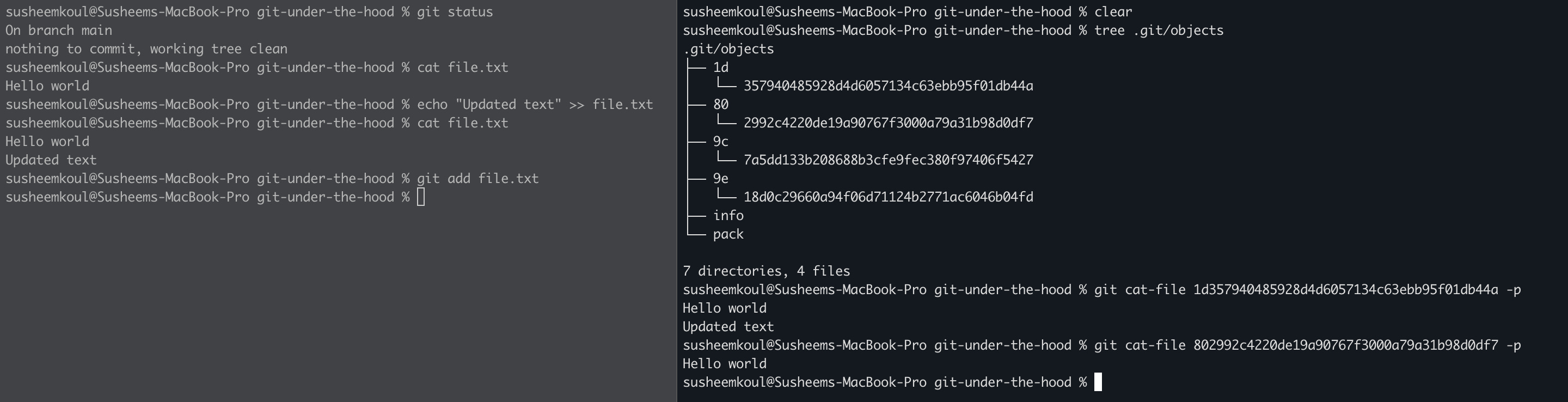 We’ve appended some new text to our committed file (remember the original file was represented by the blob : 802992c4220de19a90767f3000a79a31b98d0df7). Now when we do git add file.txt, under the hood, git hashes our files contents and gets a new hash value : 1d357940485928d4d6057134c63ebb95f01db44a. A new file is stored in the objects directory inside .git with the updated contents but you can see the old file and its hash are still there.