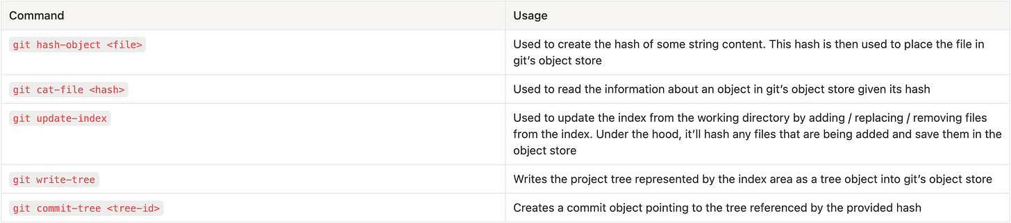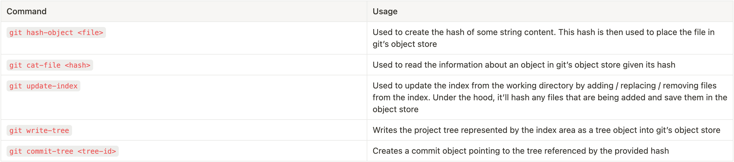 git write-tree/git commit-treecommands that work under the hood when you do a commit. In short, the write-tree command will create the tree object from all the files in the staging area and store it in the object store. The files in the staging area might be in nested folders so the command will create those nested trees too. The commit-tree command will create the commit object and point it to the given tree and optionally a parent commit.