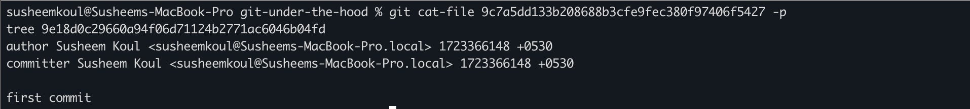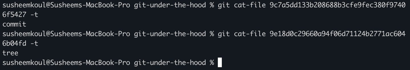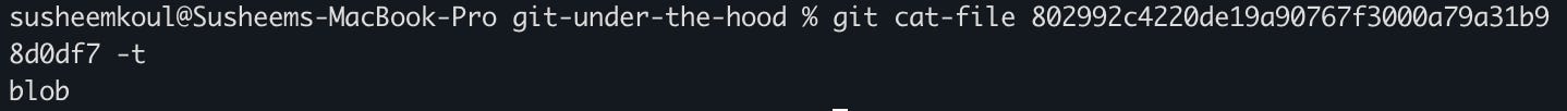 As we will see soon, the directories are also given the same treatment, i.e., they are hashed and the stored in the objects folder. In essence, this objects folder is a key:value store where the key is the hash generated from the stored object and the value is the object like file/directory etc. Git uses several types of objects and we will cover some core ones here. You can use the git cat-file command with the -t flag to check the type of an object. Let’s run it on the file we created just now