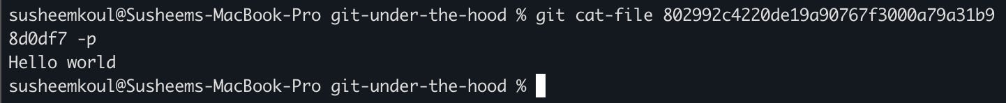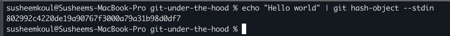 We also noticed that git created some sort of folder / file names to store our file in. This folder / file name is actually derived from a hash of the file contents. There is a utility command git hash-object which can be used to hash the contents of a file (or a given input string). Our file contained the text Hello world . This got hashed to 802992c4220de19a90767f3000a79a31b98d0df7. If we run this text through the git hash-object command, we should ideally see the same result