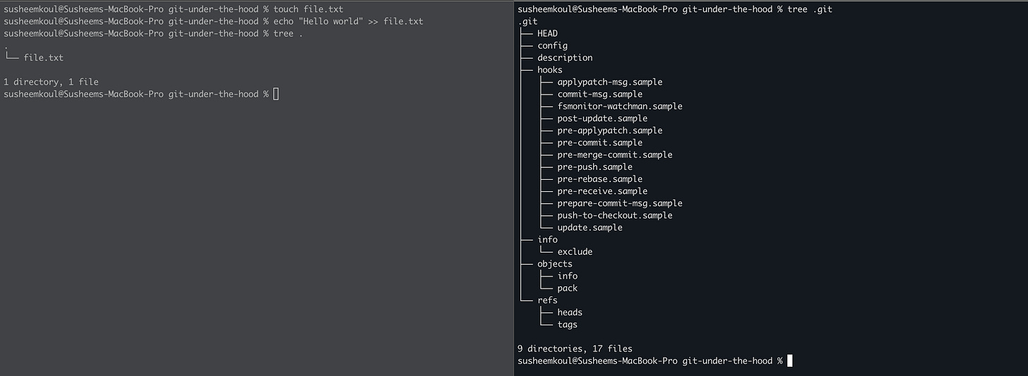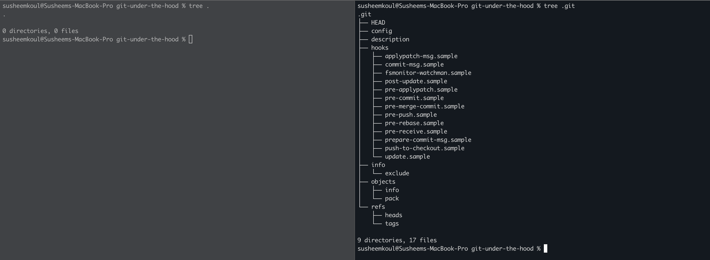 Let’s go ahead and setup a fresh git enabled project folder using git init. This is the state of the git repository at the moment. Note: All the images in this article will try to show side by side view of the .git folder (on the right) and the actual working directory tree.