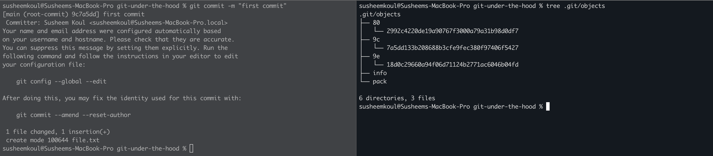 Let’s switch gears to the commit process now. We already have our file in the index. Let’s commit and see what happens to the .git/objects folder.