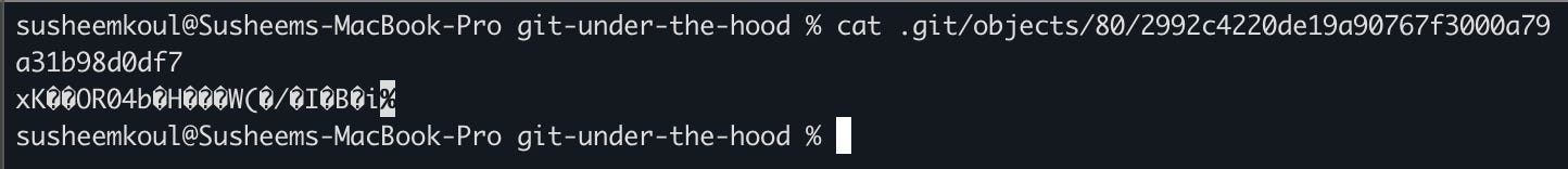 git cat-file is a low level command that allows you to read git repository files which are generally not suitable for human viewing. The format is simply git cat-file <object-hash> -p . Object hash is constructed by appending the folder name inside git objects (80 in this case) with the file (2992c4220de19a90767f3000a79a31b98d0df7)