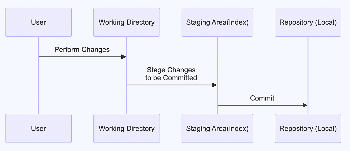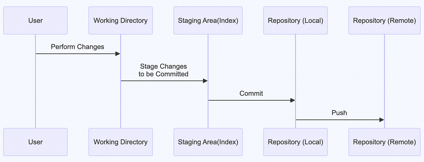 With these steps, you have successfully setup a git repository as well as made your first changes in both local and remote. These steps are often represented in the form of the well-known three stage model of git shown in the diagram below