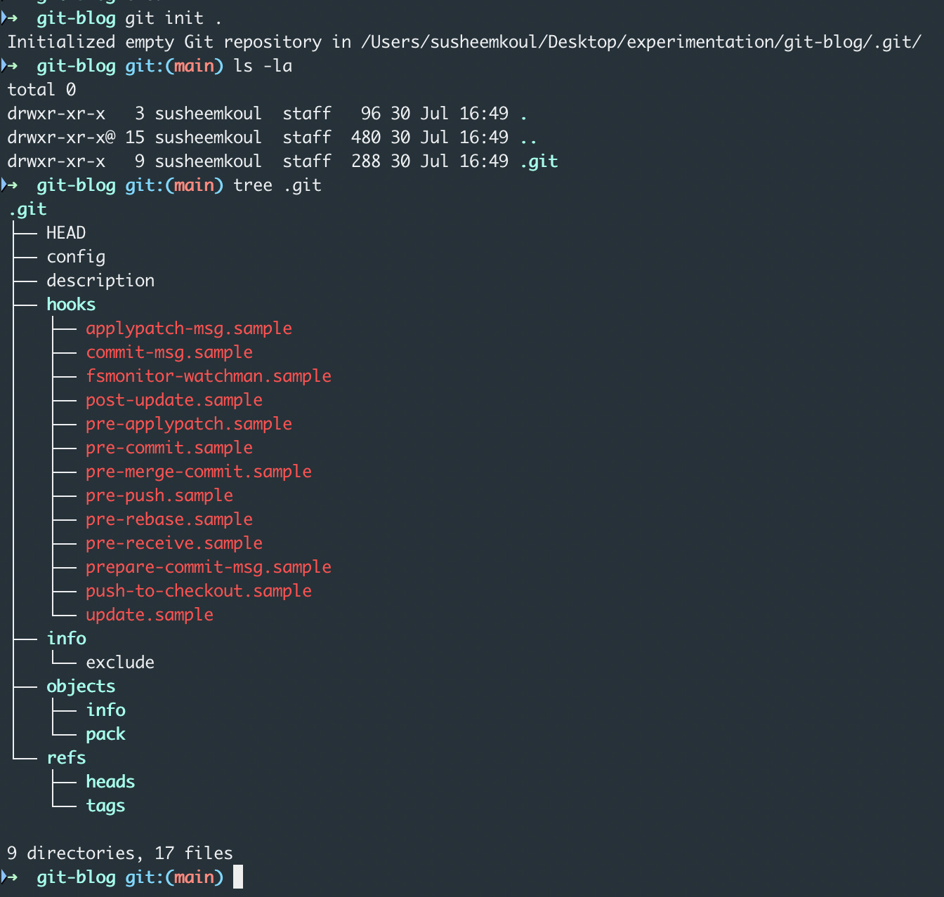 In our case, here is what happens when we init an empty git repo. I’ve also shown the directory tree for the .git folder although this will make much more sense in some of the upcoming articles.