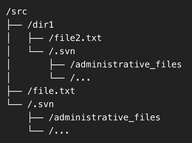 .svndirectory inside it. This directory contains the original copy of the files in the containing directory along with other meta information that helps SVN in tracking what has changed in a directory. The.svndirectory is present in all directories in the working copy, not only the root directory.Every directory in a working copy has a