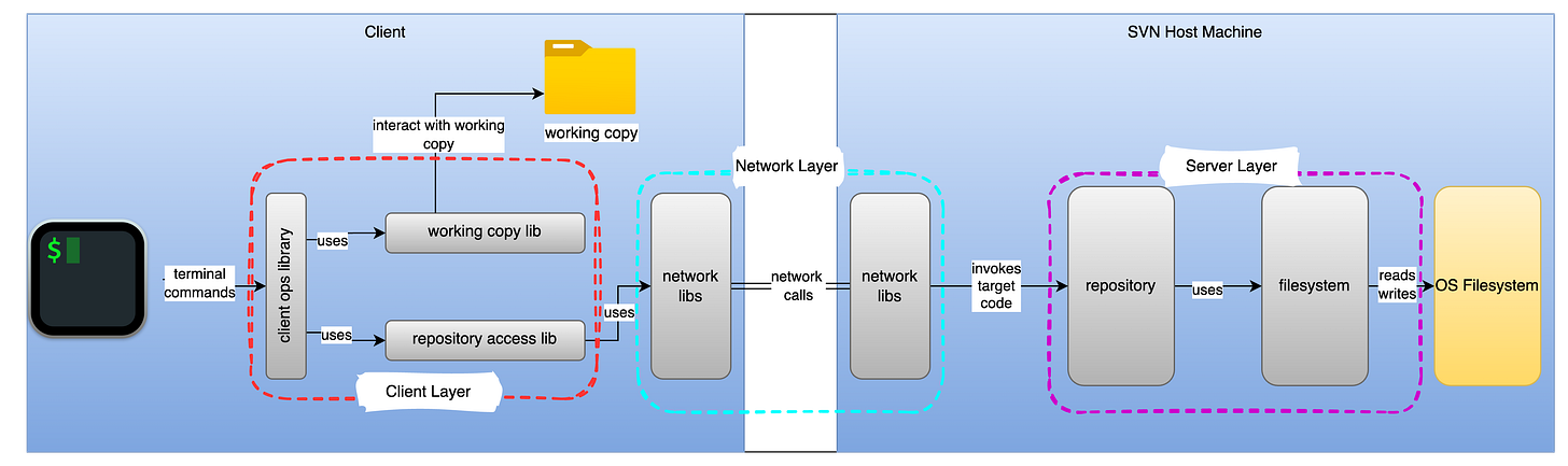 Network Layer: Deals with the transmission of client side commands to the SVN Repository. This layer also handles the receiving of the request on the server and routing it to the appropriate server module.